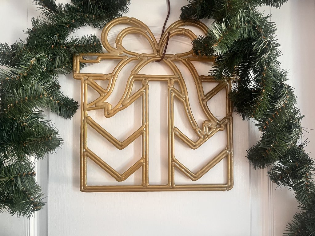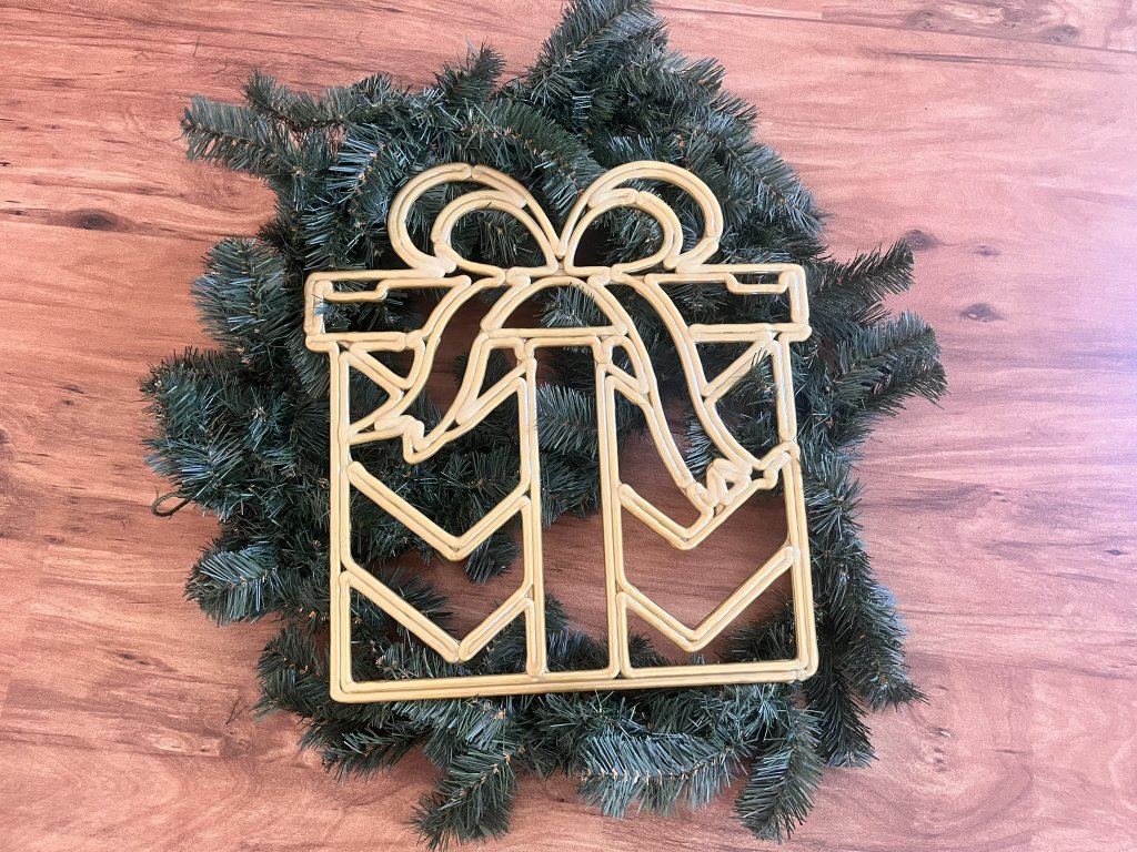 Dekorace je vybavena dvěma úchyty pro rychlé a bezpečné uchycení. Zlatý dárek se skvěle kombinuje s koulemi či baňkami a dodá výzdobě elegantní, harmonický vzhled.