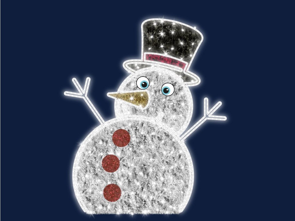 Dodejte své vánoční výzdobě kouzlo zimní pohádky se světelným 2D sněhulákem! Tento 150 cm vysoký a 125 cm široký sněhulák s černou čepicí a bílým výpletem z umělého jehličí je stylovou dekorací i fotopointem pro města, obce, nákupní centra či adventní trhy.